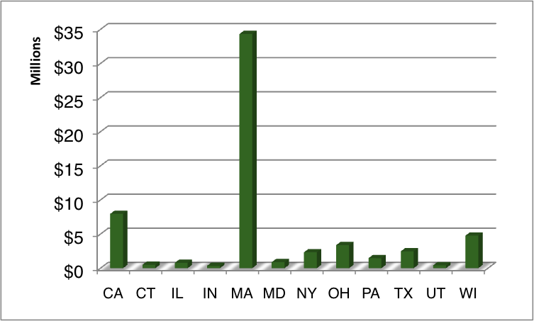 Finally, the majority of the 59 M$ dollars went to institutions in Massachusetts (34.2 M$, 58 %) and California (7.7 M$, 13%).